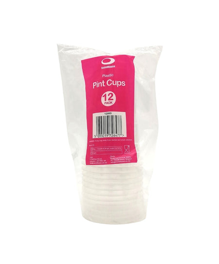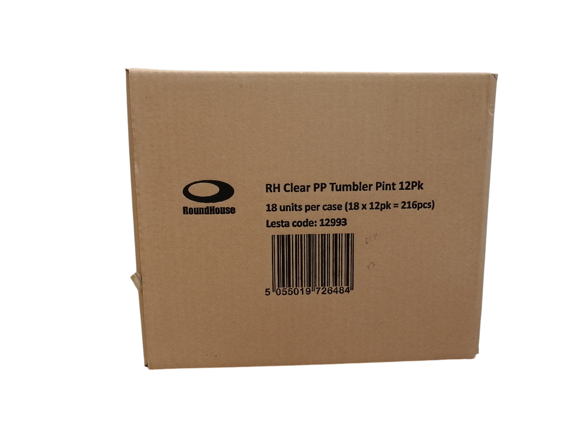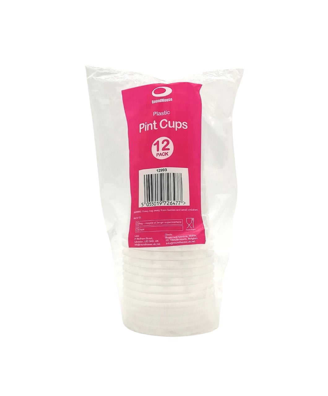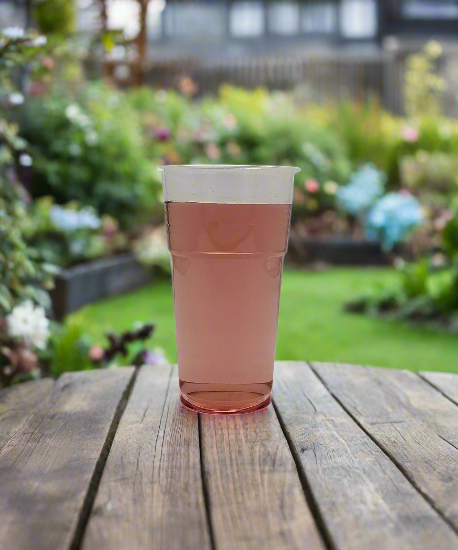 Clear disposable plastic pint tumbler, ideal for serving cold drinks at parties, events, or outdoor use. Disposable and lightweight.